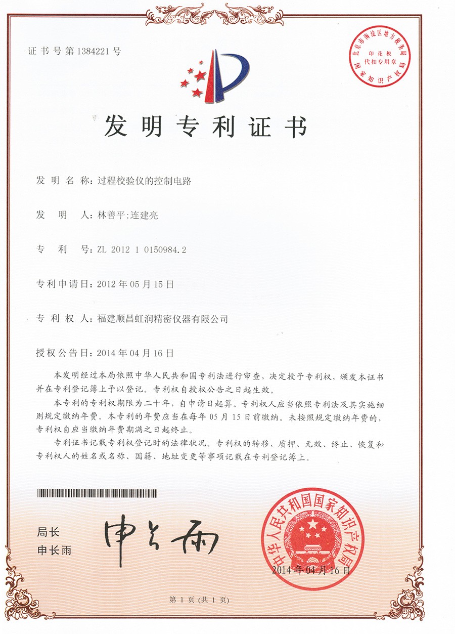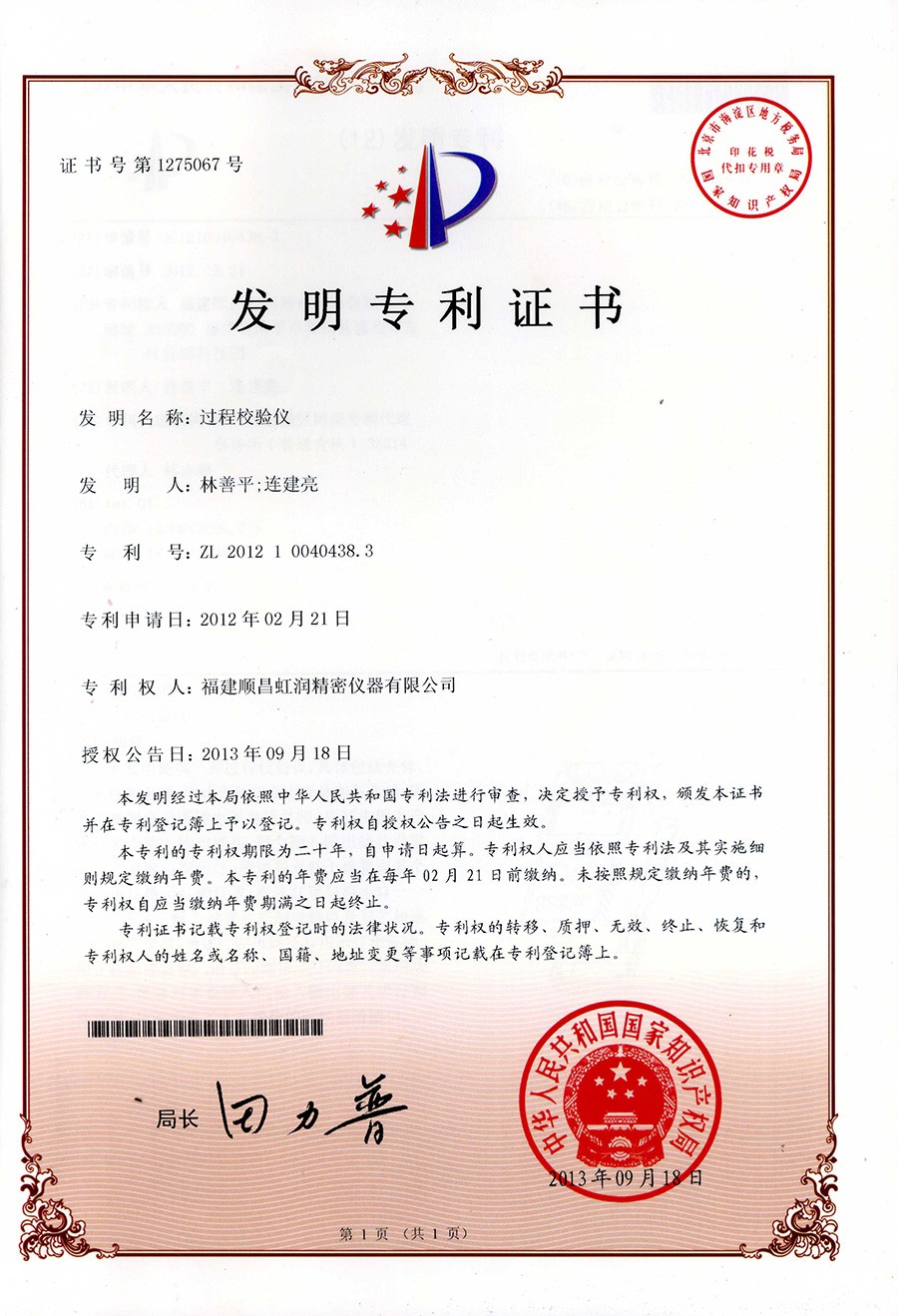 | 過程校驗(yàn)儀發(fā)明 發(fā)明專利證 |