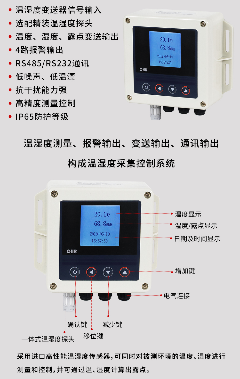 溫濕度控制器以先進的32位ARM處理器為核心,采用進口高性能溫濕度傳感器,可同時對被測環境的溫度、濕度進行測量和控制,并可通過溫、濕度計算出露點。它具有精度高、穩定性強、響應速度快等特點,適用于通訊機房、辦公室、醫院、檔案館、博物館、賓館、樓宇自控等場所的溫濕度測量。