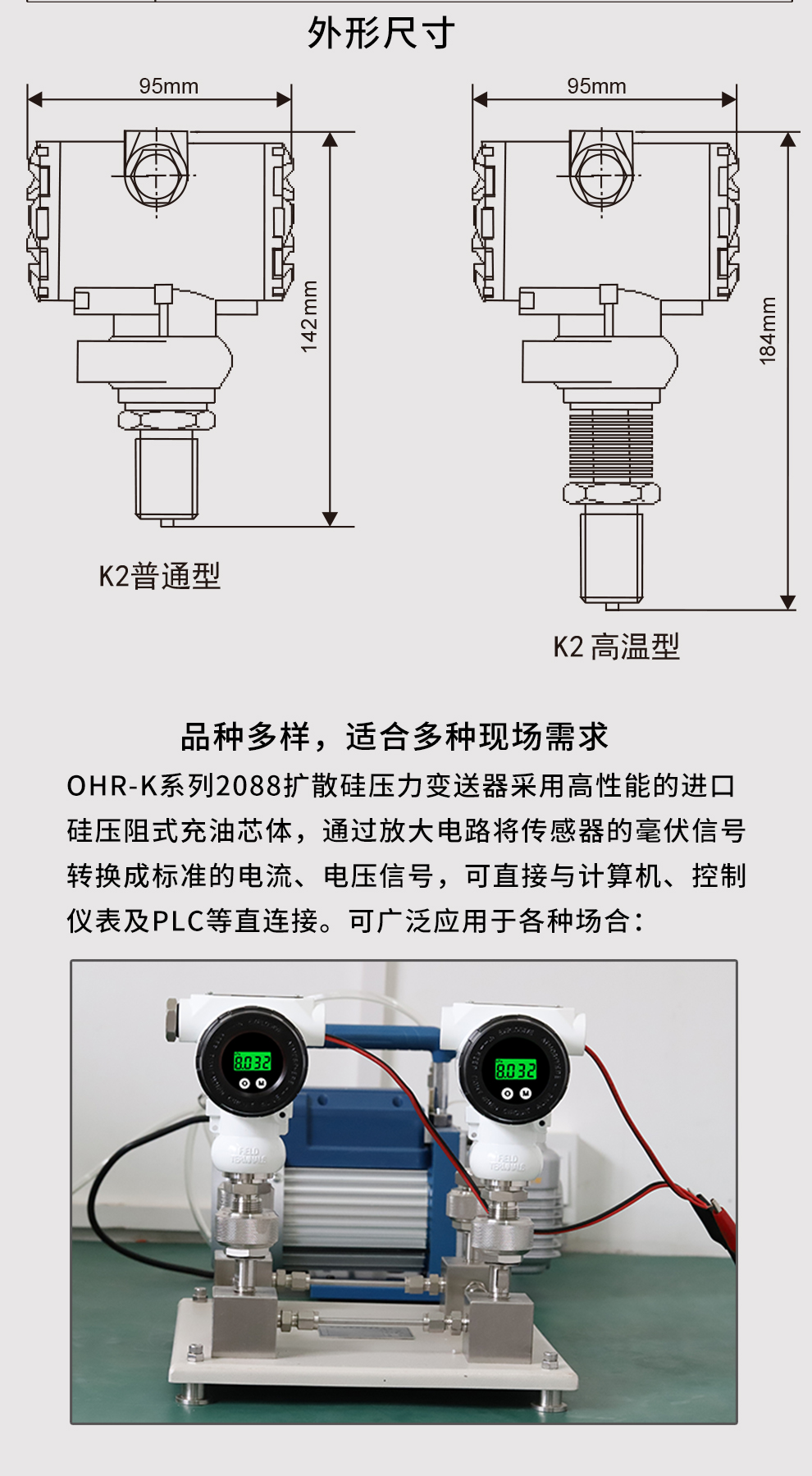 • K系列壓力變送器采用具有國際先進水平的擴散硅傳感器,配合高精度電子元件,經嚴格的工藝過程裝配而成。充分發揮了傳感器的技術優勢,使該系列壓力變送器具有優異的技術性能。該變送器抗過載和抗沖擊能力強、溫度漂移小、穩定性高,具有很高的測量精度。