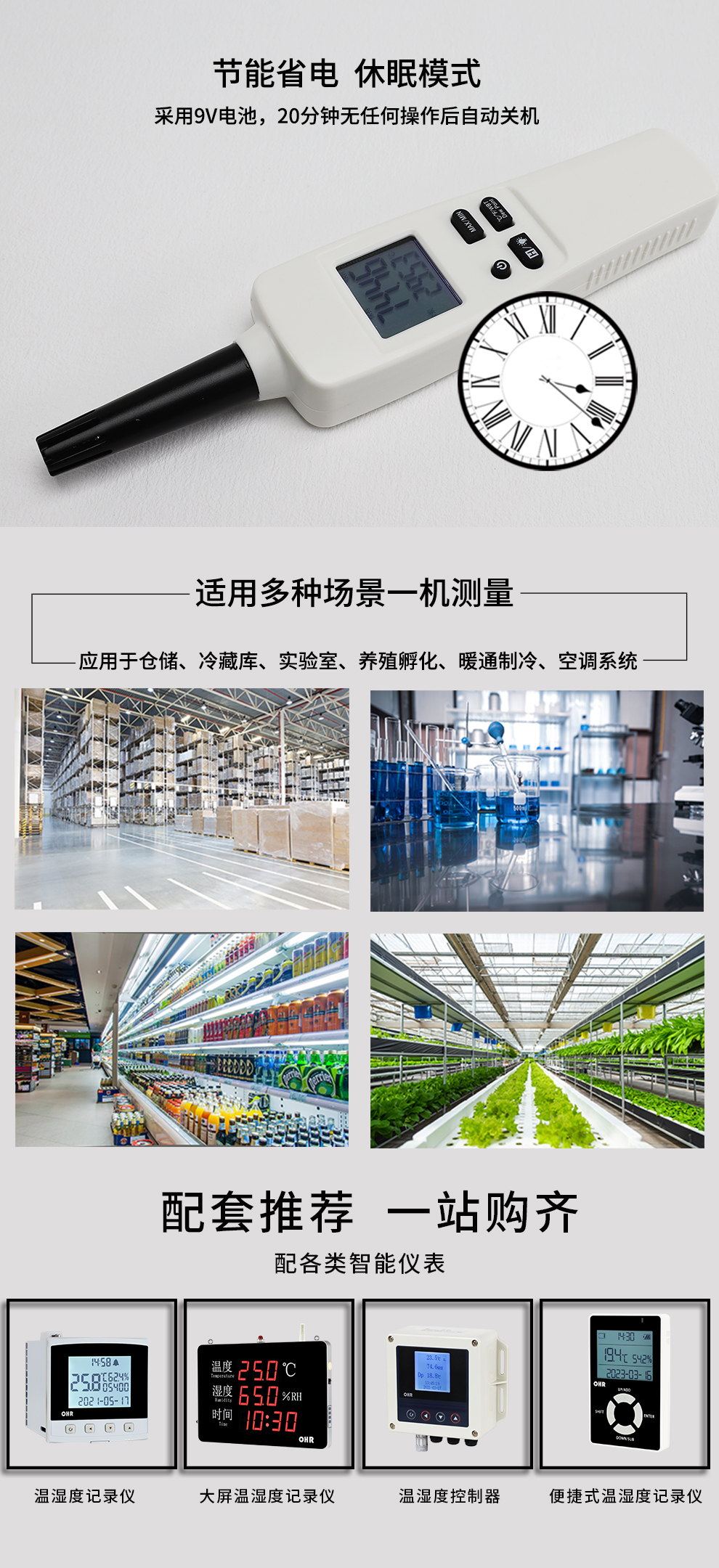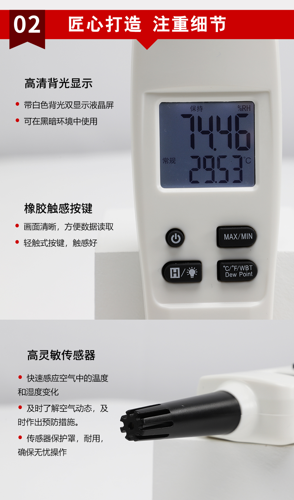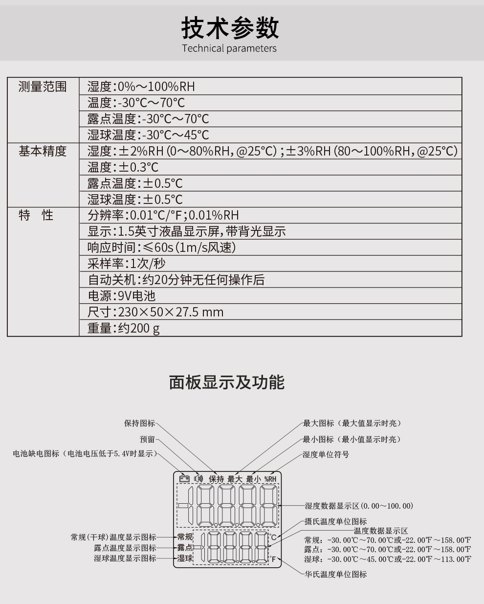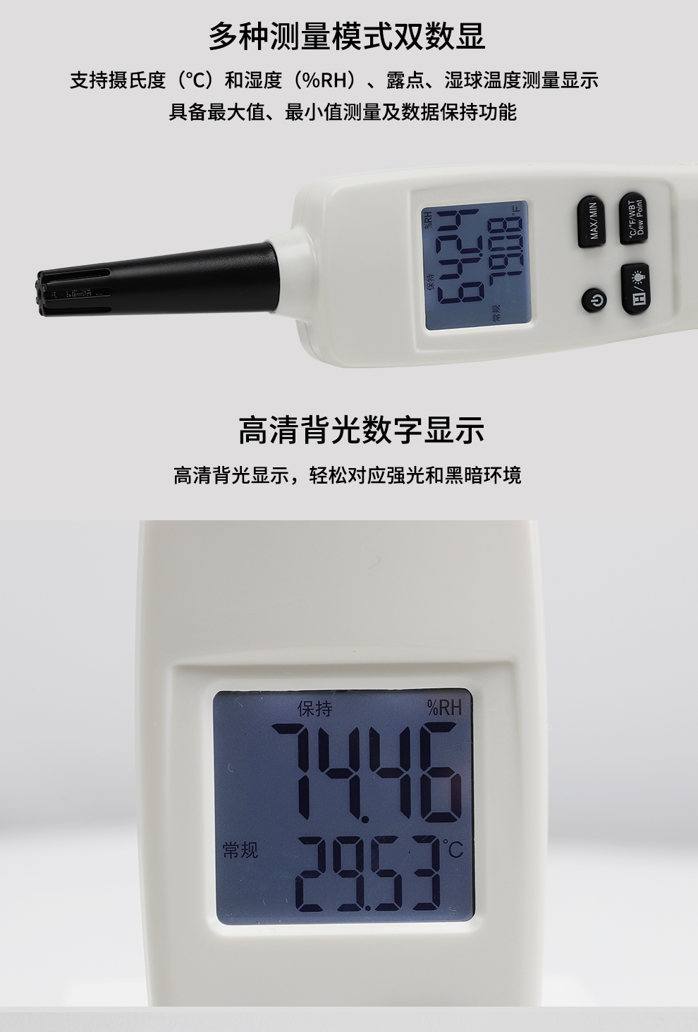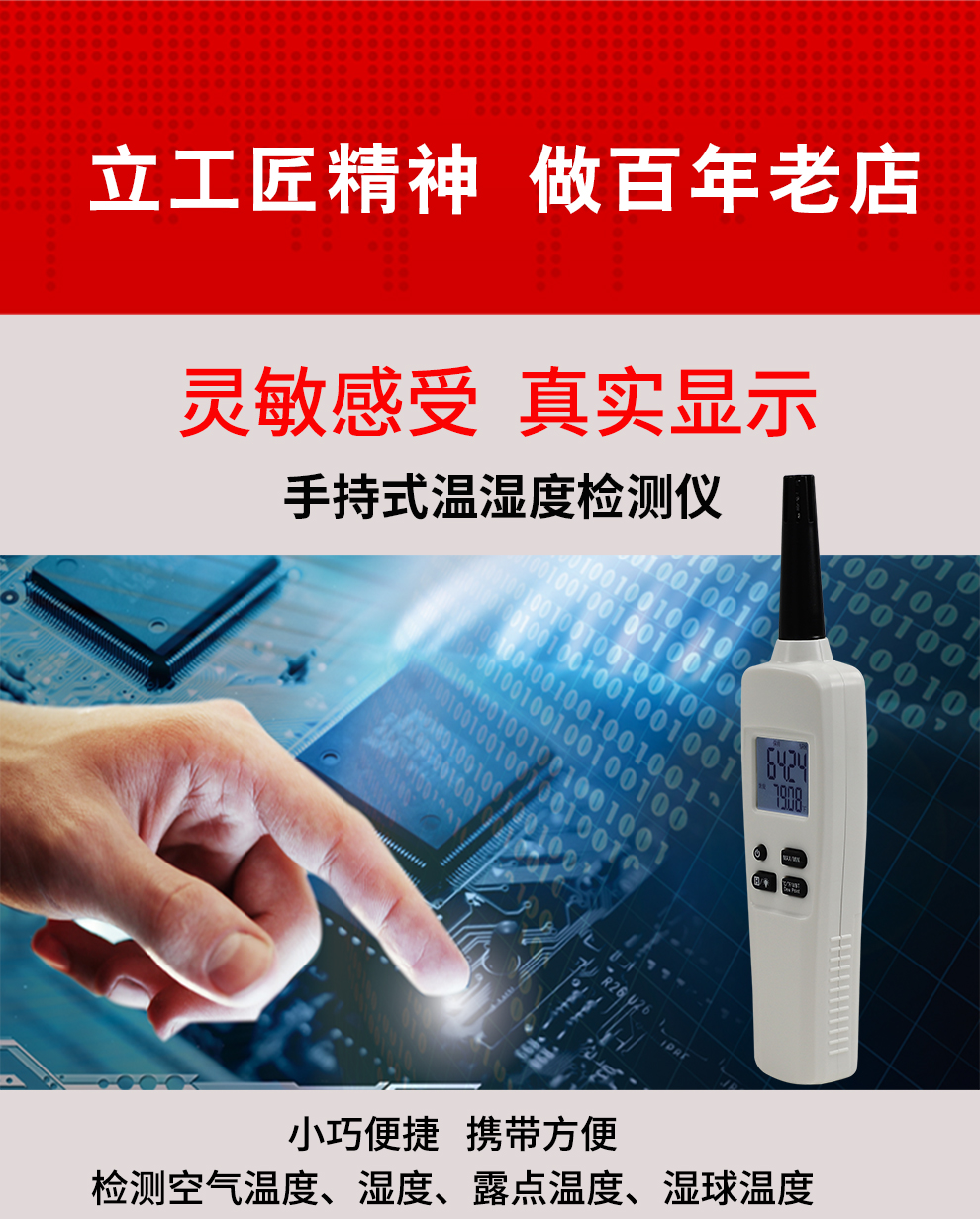 • 小巧便捷,攜帶方便,檢測空氣溫度、濕度、露點溫度、濕球溫度。