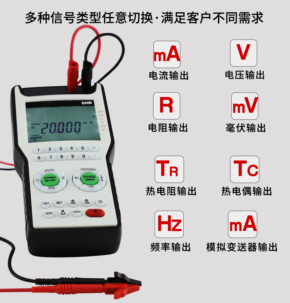 信號發生器是一種多功能、高精度便攜式信號源,可用于輸出各種規格的工業信號,支持電流、電壓、電阻、頻率、熱電偶、熱電阻等多種信號輸出類型,最高精度可達0.01%F.S,是工業現場、實驗室以及各類儀表制造商必備的計量測試工具。