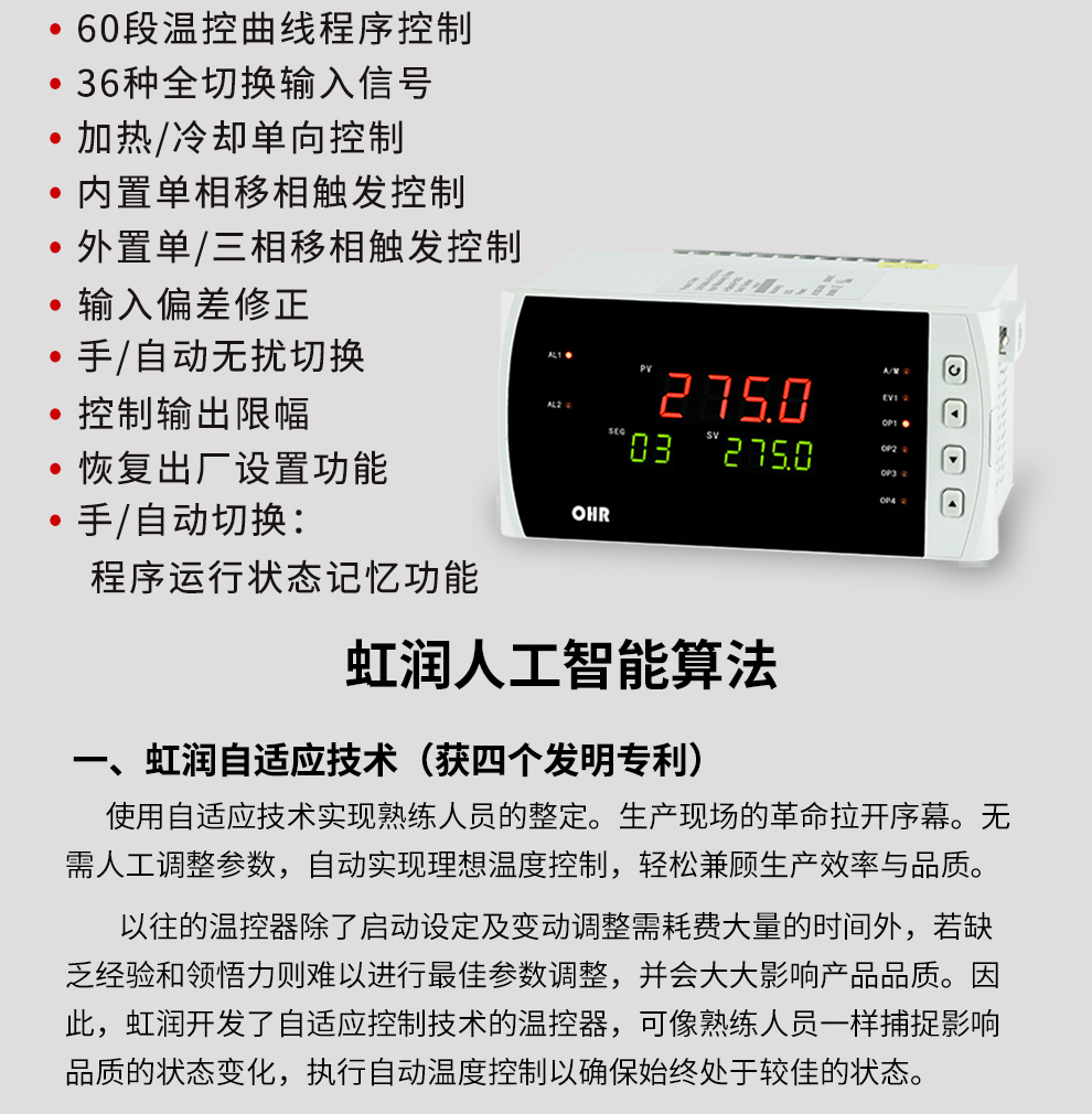 OHR-E400系列60段人工智能溫控器采用真正的人工智能算式,儀表啟動自整定功能,可以根據被控對象的特性,自動尋找參數以達到很好的控制效果,無需人工整定參數??販鼐然具_±0.1℃,無超調、欠調,達國際先進水平。
