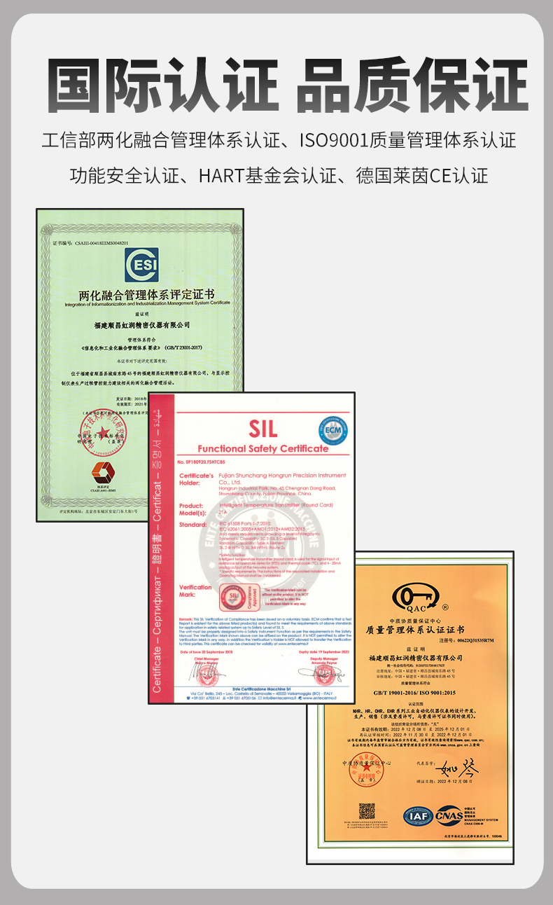 虹潤公司是專業生產溫度變送器的國家專精特新“小巨人”企業。生產的智能溫度變送器,具有適配各類溫度傳感器,精度高,穩定性好,通過編程線修改輸入信號類型及量程,高抗干擾等特點。該產品不僅通過HART基金會認證、德國萊茵 CE 認證與 SIL 功能安全認證,還獲得具備減震抗干擾能力的溫度變送器、信號隔離器、一種二端子模塊、無源信號隔離器等4項國家發明專利,主持起草物聯網智能溫度儀表、現場設備工具(FDT)接口規范、工業過程測量和控制系統用溫度變送器等3項國家標準,以及通信系統多通道數據采集控制終端規范軍用標準,參與國際5G標準制定,取得智能溫度變送器、HART溫度變送器等3項相關軟件著作權。產品廣泛應用于石油、化工、電力、冶金、制藥、食品、水處理等各種工業領域。